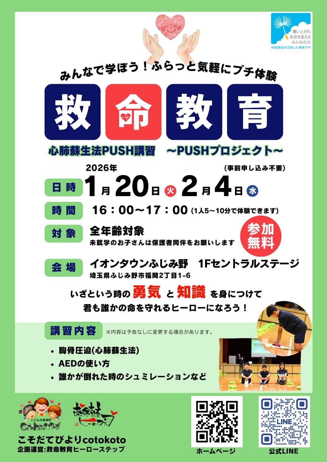 富士見市・三芳町・ふじみ野市を中心に、近隣の小中学校および特別支援学校で授業として行っている PUSH救命講習のプチ体験を実施します。